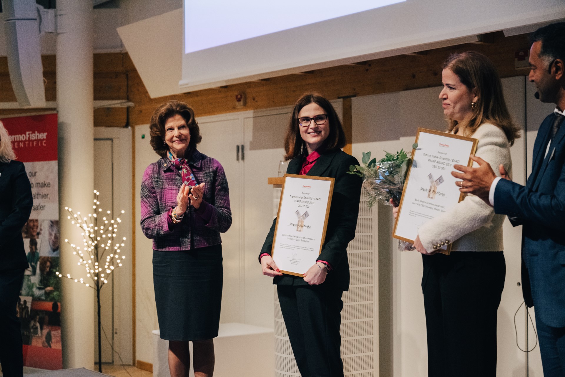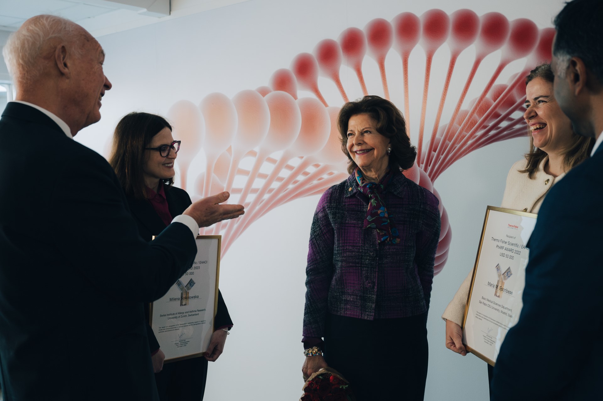 Hennes Majestät drottning Silvia var hedersgäst och uppmärksammade PhARF-pristagarna från Thermo Fisher Scientific och European Academy of Allergy and Clinical Immunology (EAACI) vid en särskild ceremoni på Thermo Fisher Scientifics anläggning i Uppsala den 5 december 2023.