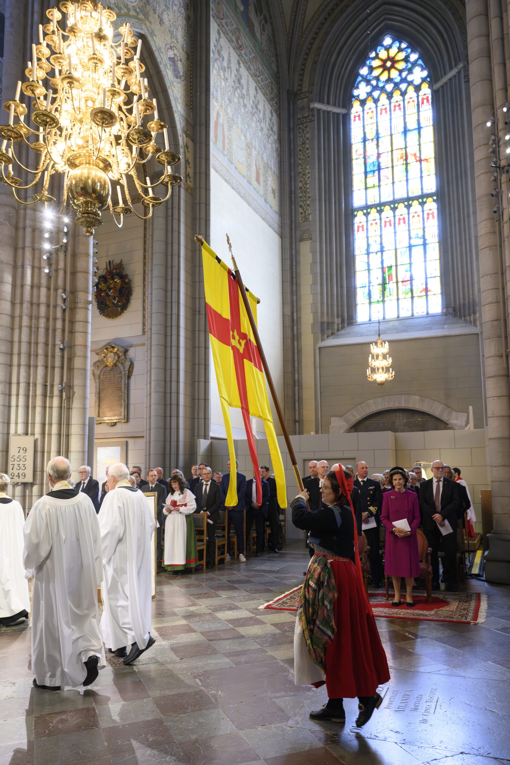 Först får kungaparet alltid skriva in i kyrkans gästbok och sedan kliver de in i Domkyrkan. När de kliver in reser alla sig upp. När kungaparet sitter ned då är det alltid tillåtet för alla andra att sitta ned.